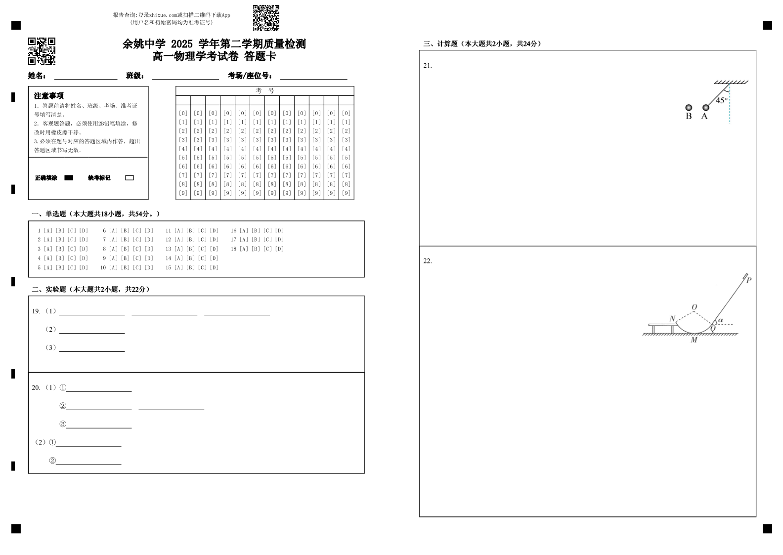 浙江省余姚中学2025-2026学年高一下学期4月质量检测 物理答题卡.pdf