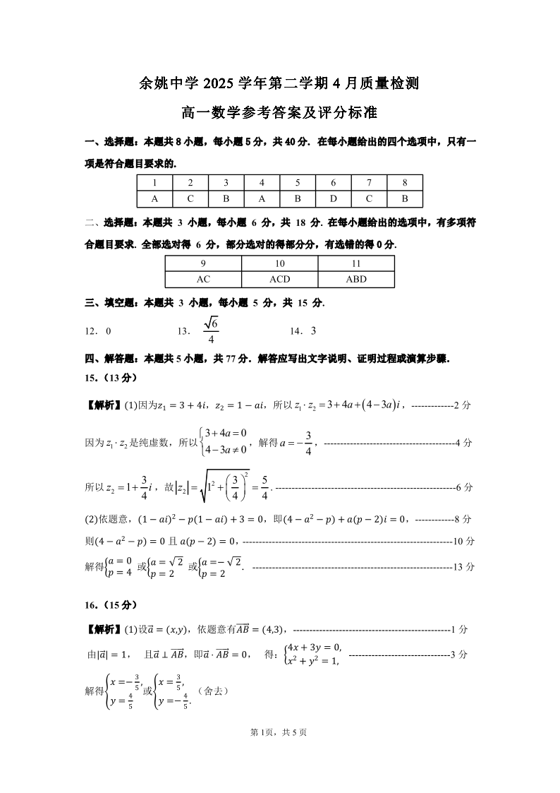 浙江省余姚中学2025-2026学年高一下学期4月质量检测 数学答案.pdf