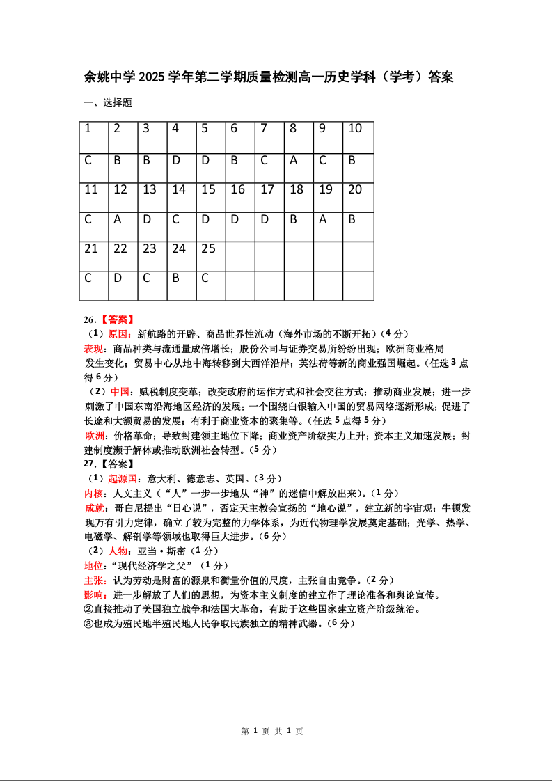 浙江省余姚中学2025-2026学年高一下学期4月质量检测 历史答案.docx