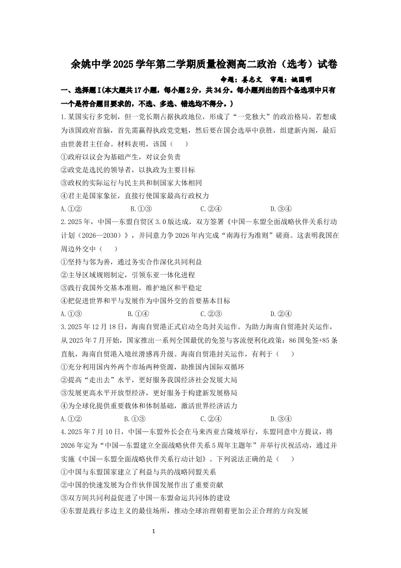 浙江省余姚中学2025-2026学年高二下学期4月质量检测 政治.pdf