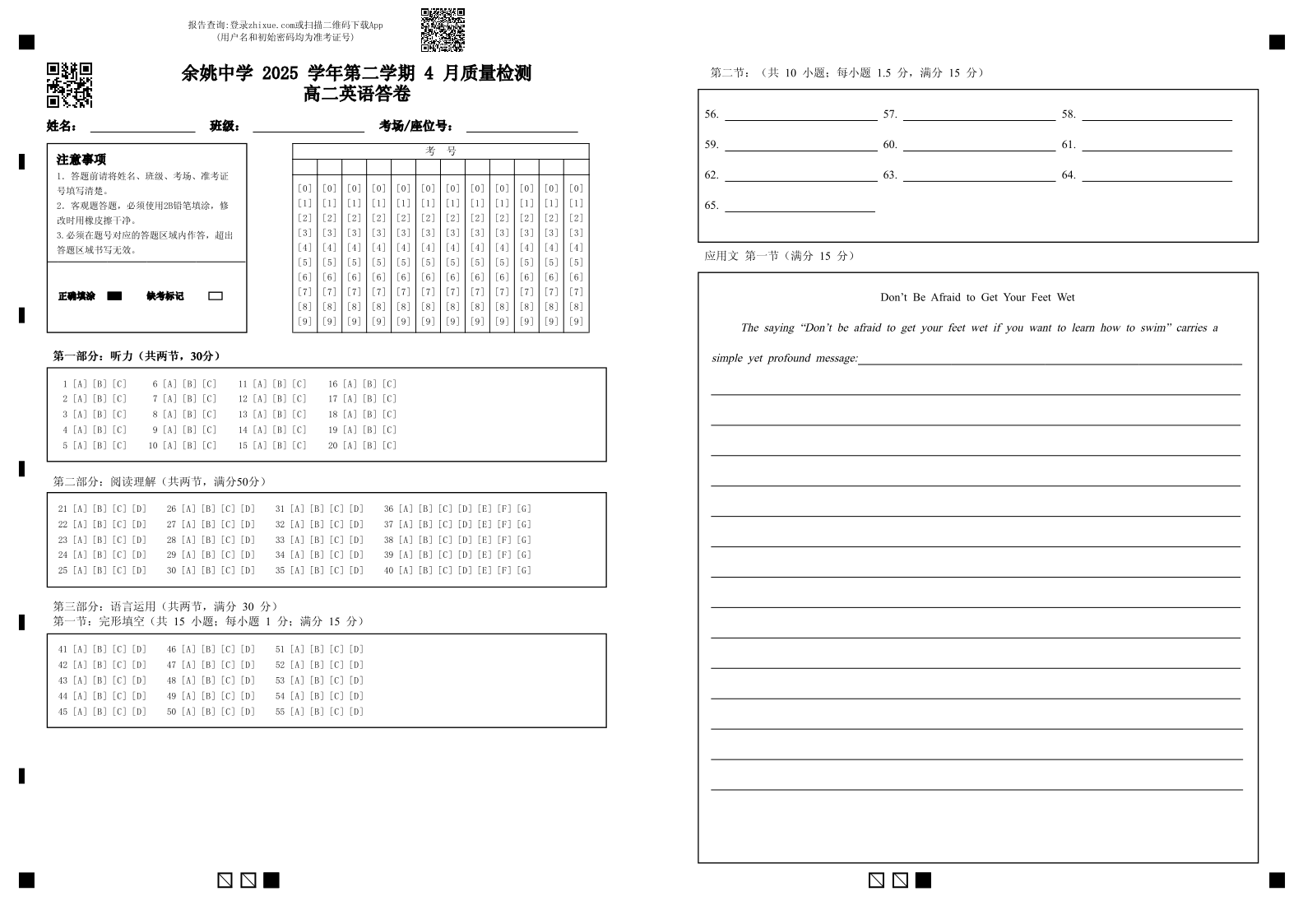 浙江省余姚中学2025-2026学年高二下学期4月质量检测 英语答题卡.pdf