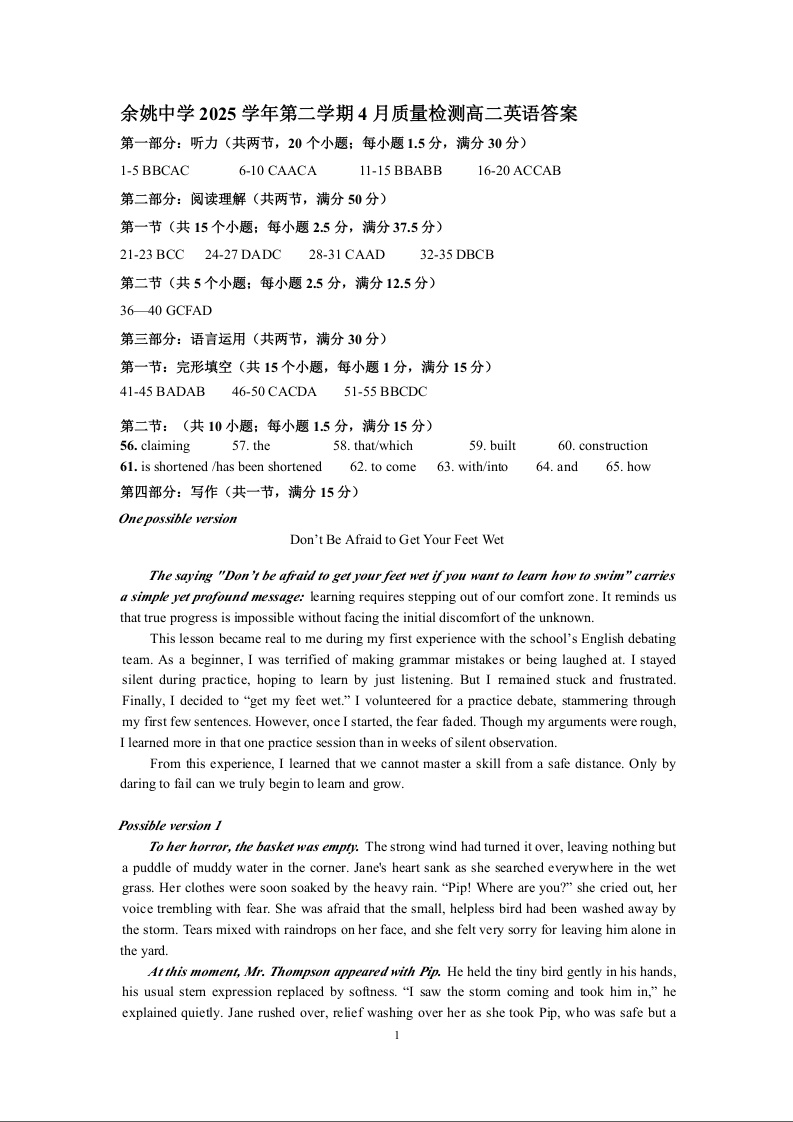 浙江省余姚中学2025-2026学年高二下学期4月质量检测 英语答案.docx