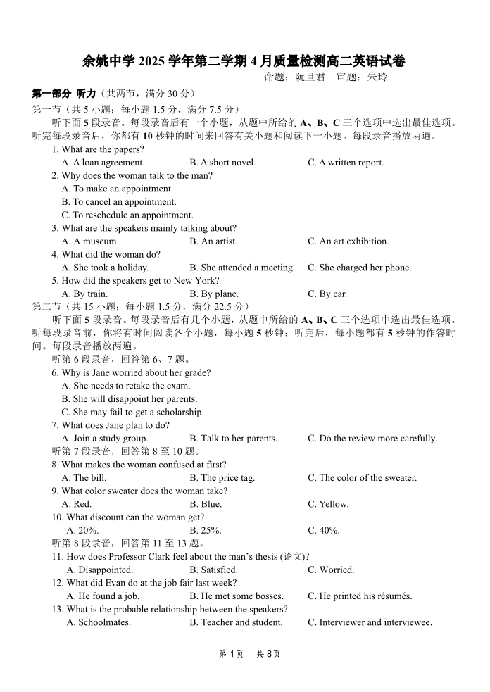 浙江省余姚中学2025-2026学年高二下学期4月质量检测 英语.pdf