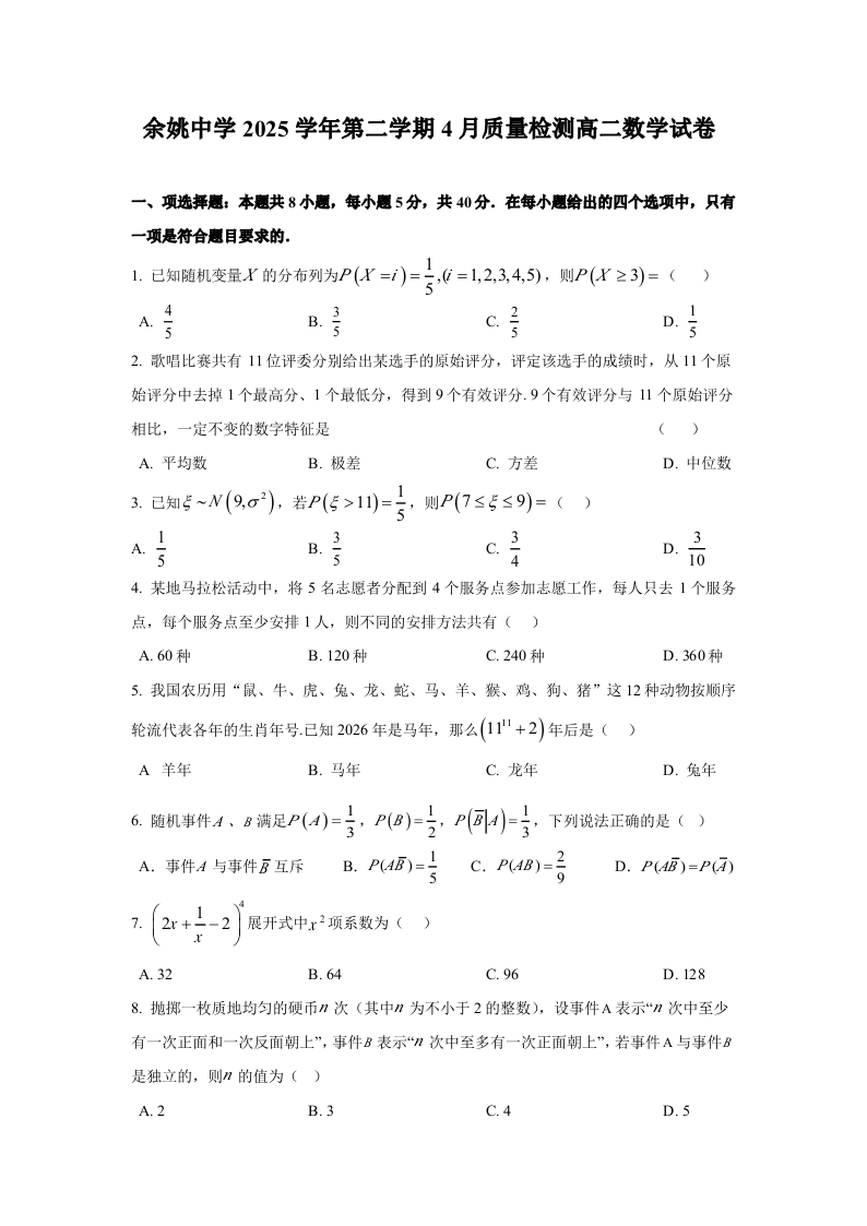 浙江省余姚中学2025-2026学年高二下学期4月质量检测 数学.pdf