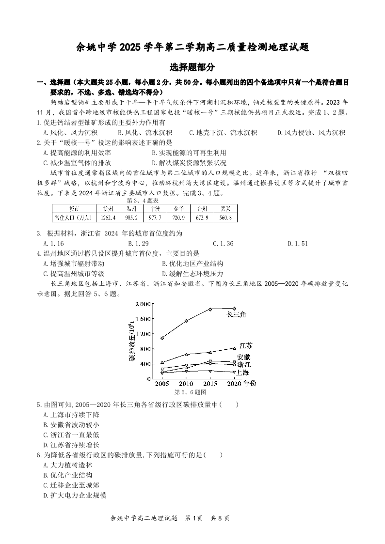 浙江省余姚中学2025-2026学年高二下学期4月质量检测 地理试卷(含答案).pdf