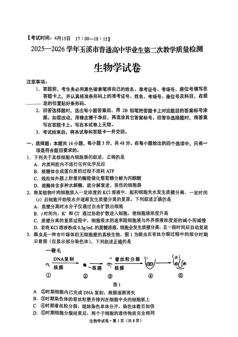 2025一2026学年玉溪市普通高中毕业生第二次教学质量检测 生物.pdf