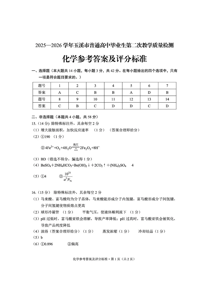 2025一2026学年玉溪市普通高中毕业生第二次教学质量检测 化学答案.pdf