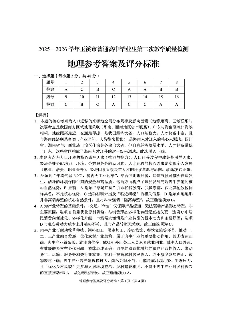 2025一2026学年玉溪市普通高中毕业生第二次教学质量检测 地理答案.pdf