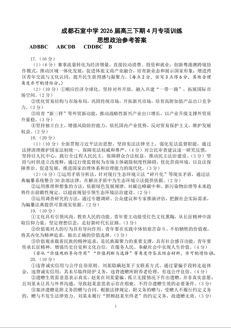 成都石室中学2025-2026学年度上期高2026届专项练习一 政治答案.docx