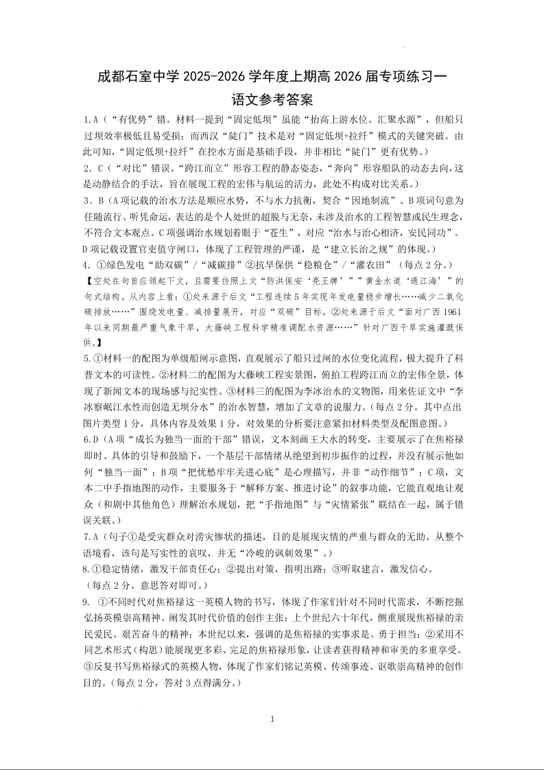 成都石室中学2025-2026学年度上期高2026届专项练习一 语文答案.docx