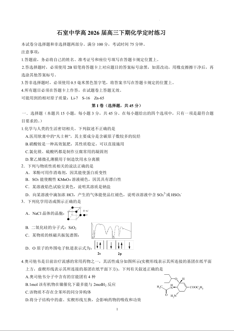 成都石室中学2025-2026学年度上期高2026届专项练习一 化学.docx