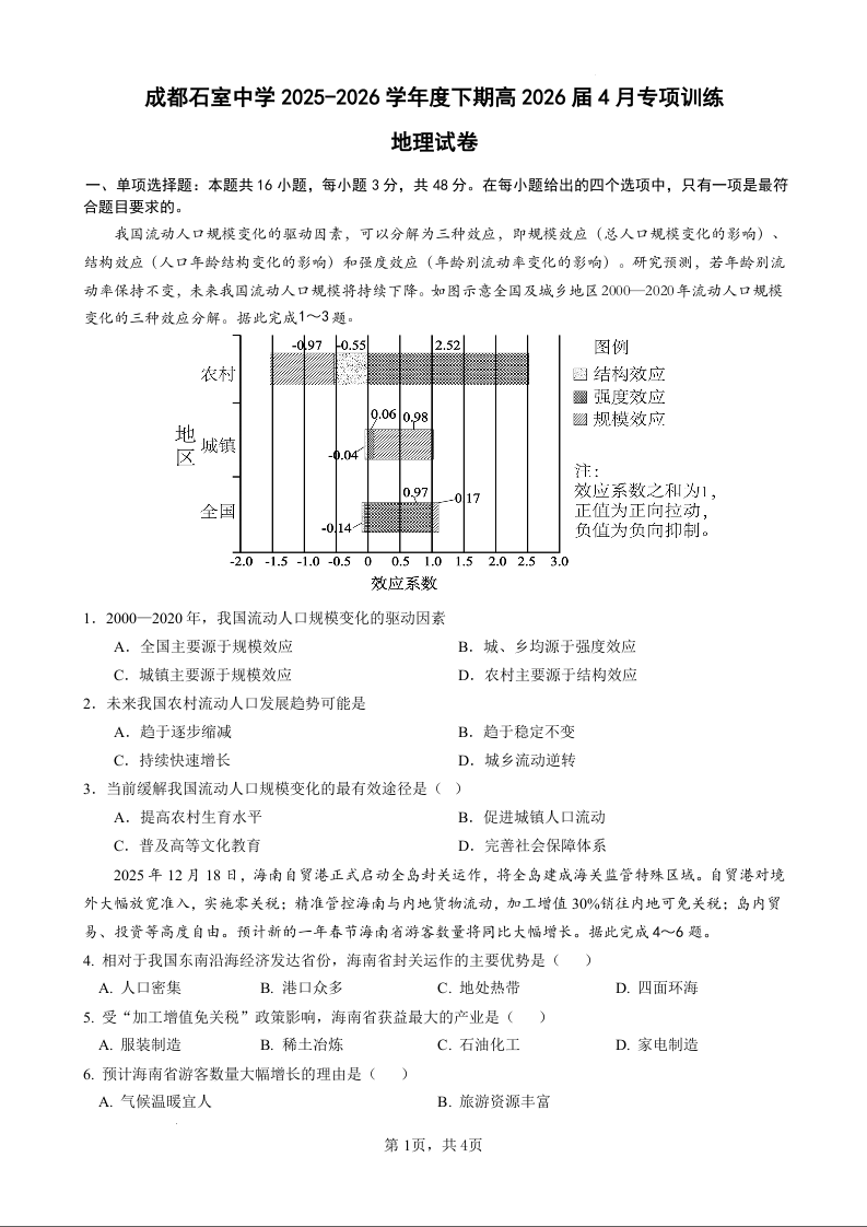 成都石室中学2025-2026学年度上期高2026届专项练习一 地理.docx