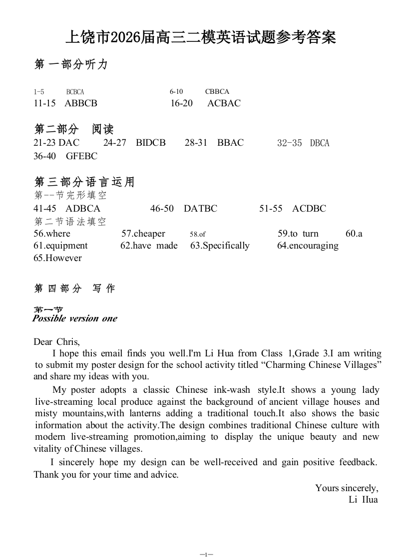 上饶市2026届高三年级第二次高考模拟考试 英语答案.docx