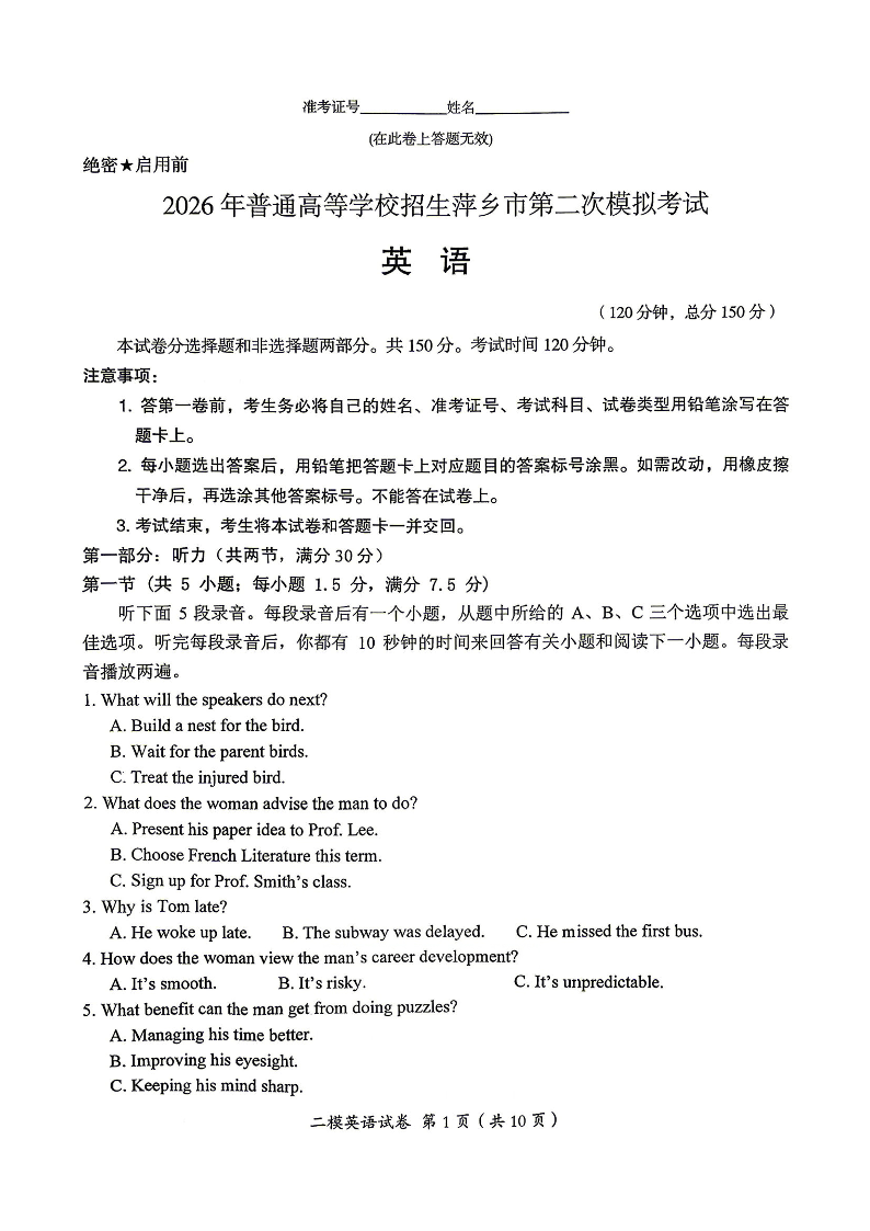 江西省萍乡市2026年高三年级第二次模拟考试 英语试题(含答案).pdf