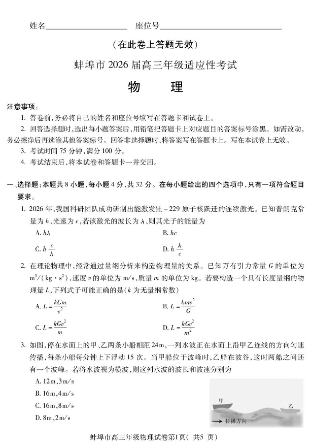 蚌埠市2026届高三年级适应性考试 物理.pdf