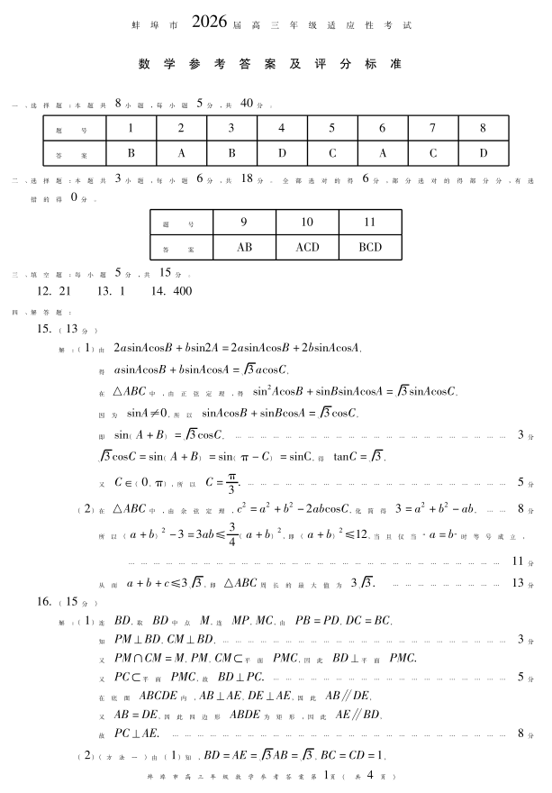 蚌埠市2026届高三年级适应性考试 数学答案.pdf