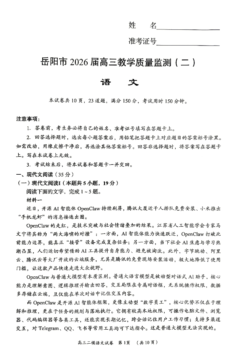 湖南省岳阳市2026届高三教学质量监测(二)语文.pdf