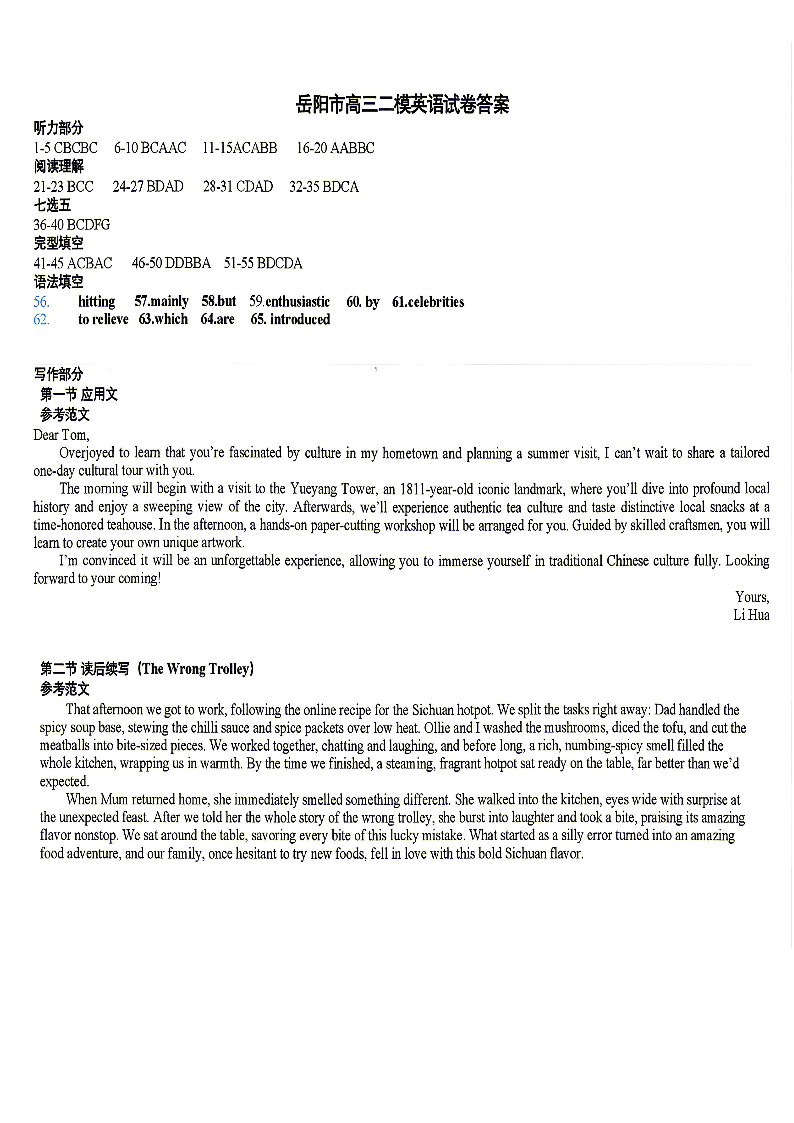 湖南省岳阳市2026届高三教学质量监测(二)英语答案.pdf