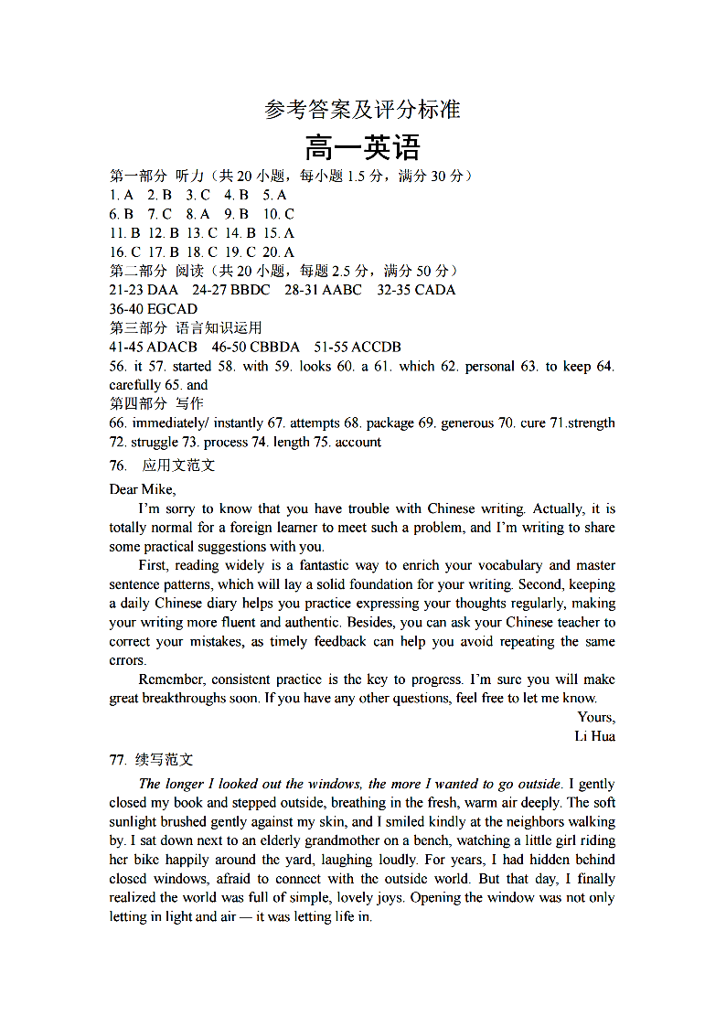 衢州五校联盟2025学年高一第二学期期中联考 英语答案.pdf