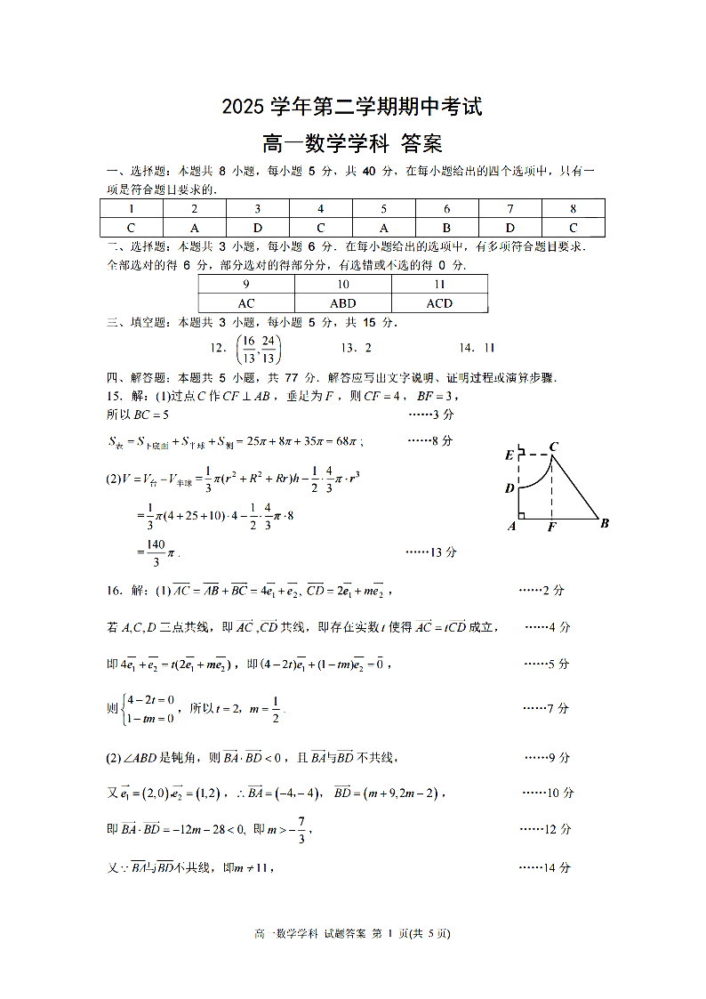 衢州五校联盟2025学年高一第二学期期中联考 数学答案.pdf