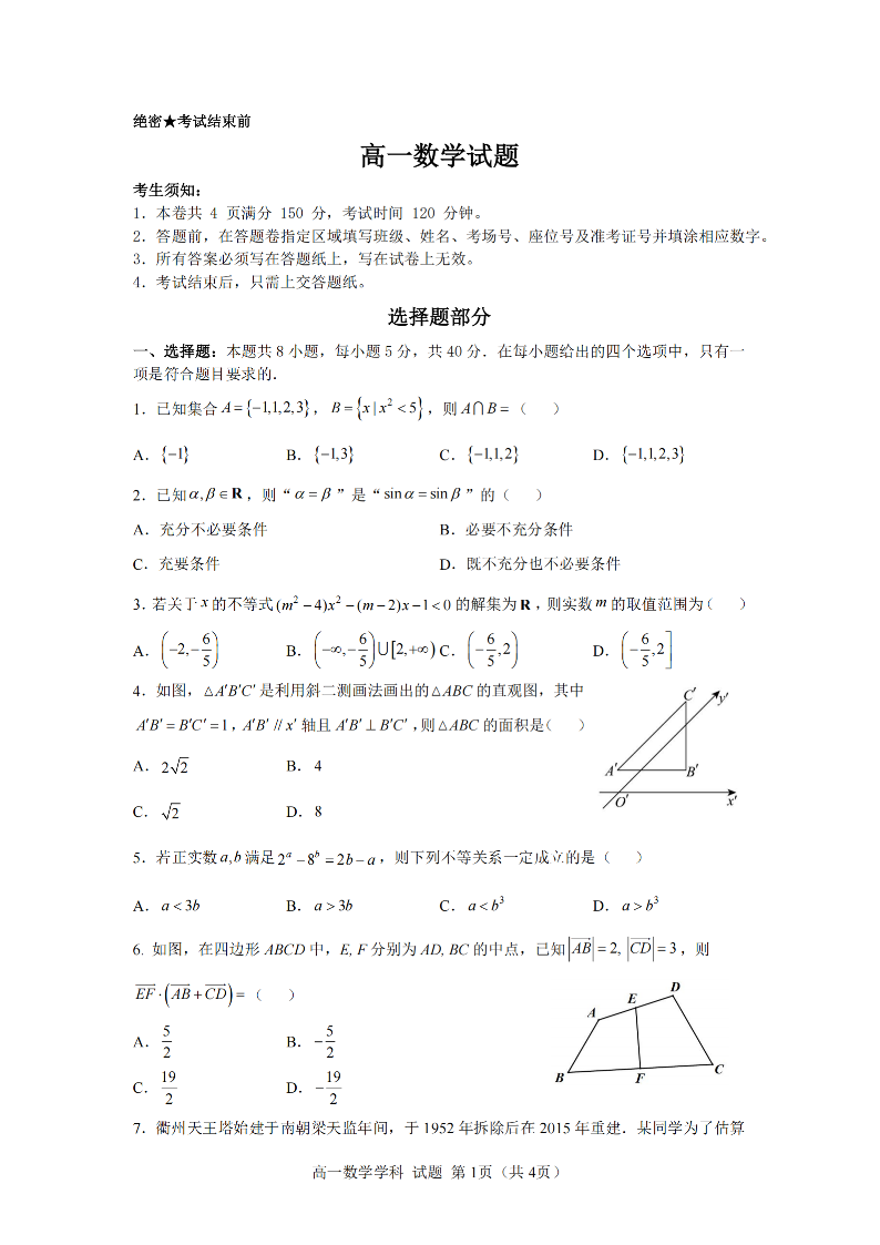 衢州五校联盟2025学年高一第二学期期中联考 数学.pdf