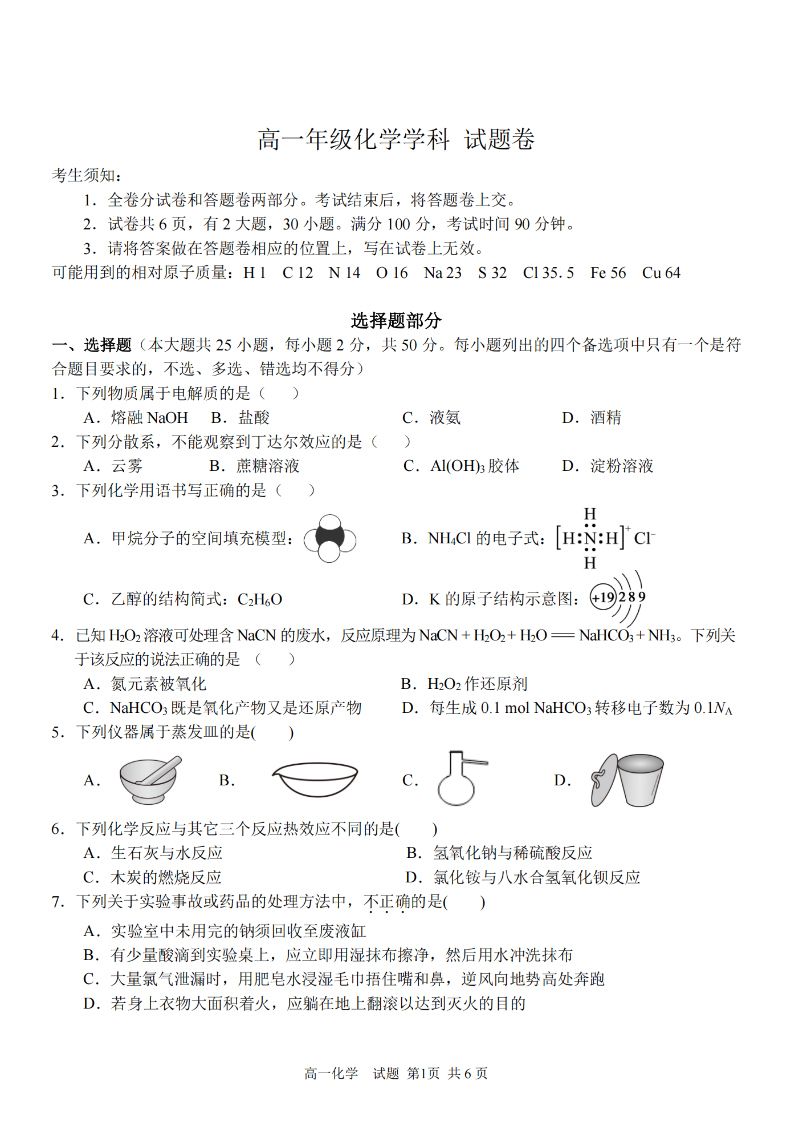 衢州五校联盟2025学年高一第二学期期中联考 化学.pdf