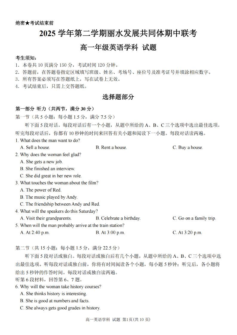 丽水发展共同体2025学年高一第二学期期中联考 英语.pdf