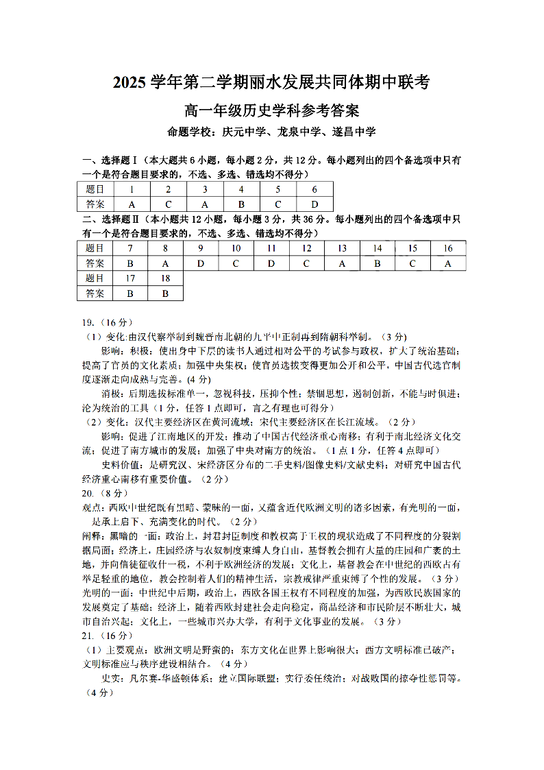 丽水发展共同体2025学年高一第二学期期中联考 历史答案.pdf