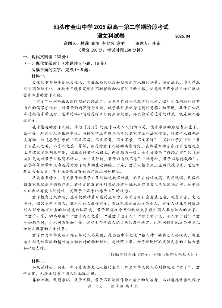 广东省汕头市金山中学2025-2026学年高一下学期阶段性考试 语文.docx