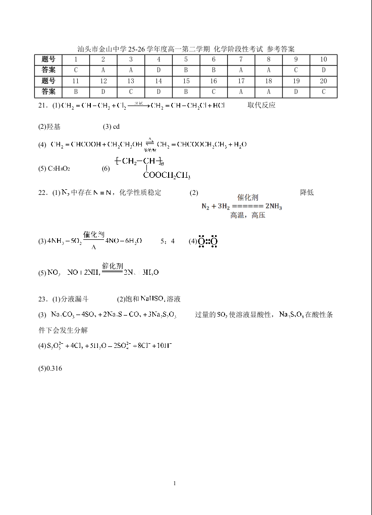 广东省汕头市金山中学2025-2026学年高一下学期阶段性考试 化学答案.doc
