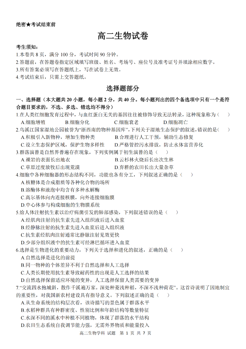 衢州五校联盟2025学年高二第二学期期中联考 生物.pdf