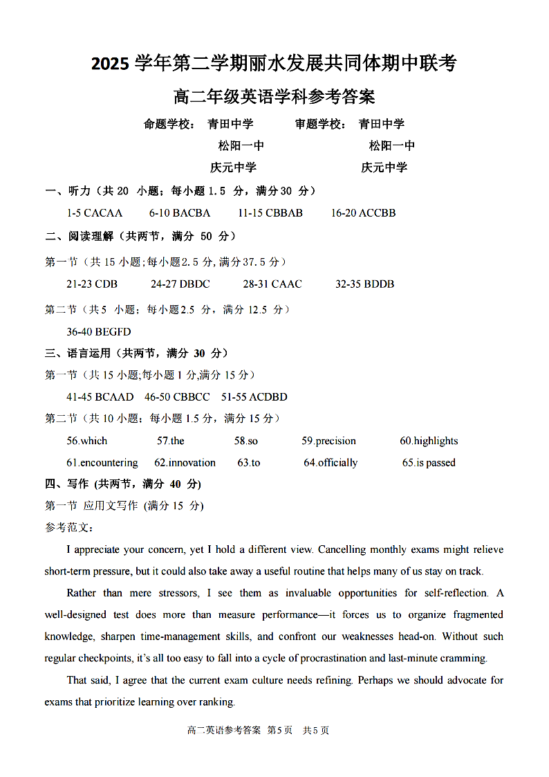 丽水发展共同体2025学年高二第二学期期中联考 英语答案.pdf