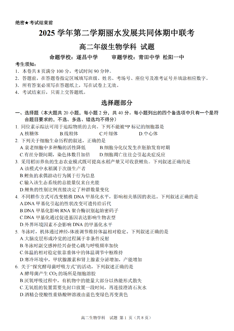 丽水发展共同体2025学年高二第二学期期中联考 生物.pdf
