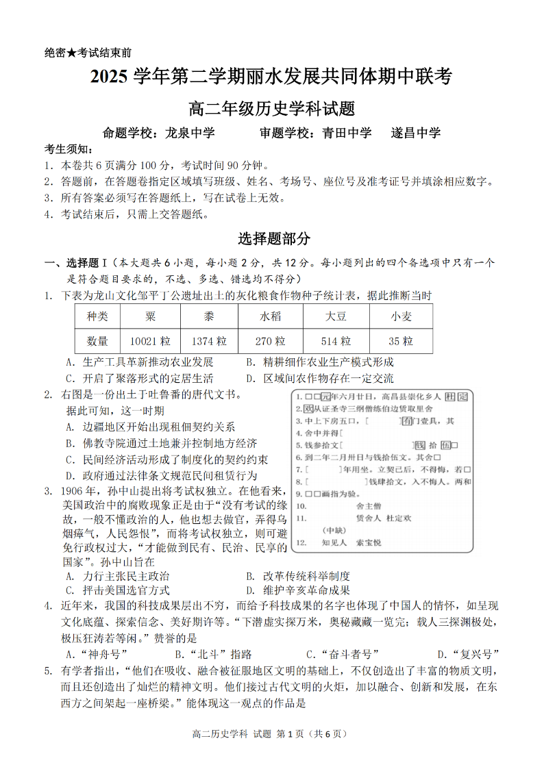 丽水发展共同体2025学年高二第二学期期中联考 历史.pdf
