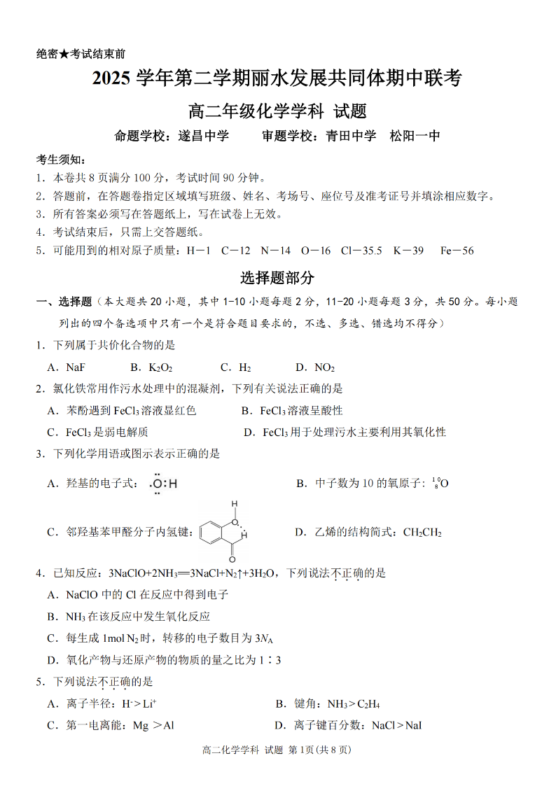 丽水发展共同体2025学年高二第二学期期中联考 化学.pdf