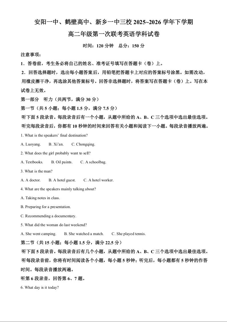河南省豫北三校2025-2026学年高二下学期第一次联考 英语.docx
