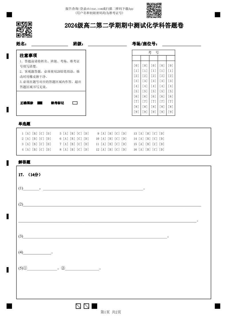 广东省汕头市金山中学2025-2026学年高二下学期期中考试 化学答题卡.pdf