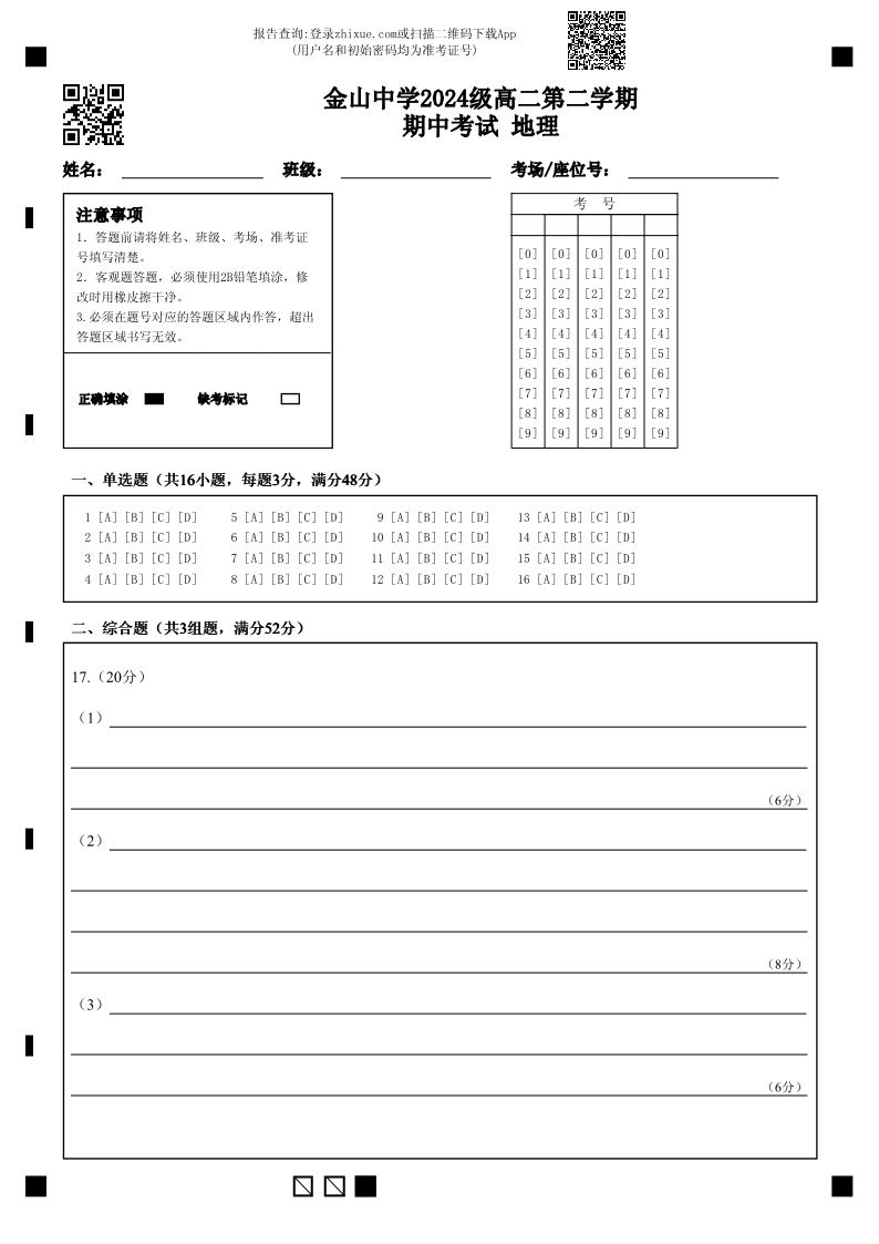 广东省汕头市金山中学2025-2026学年高二下学期期中考试 地理答题卡.pdf