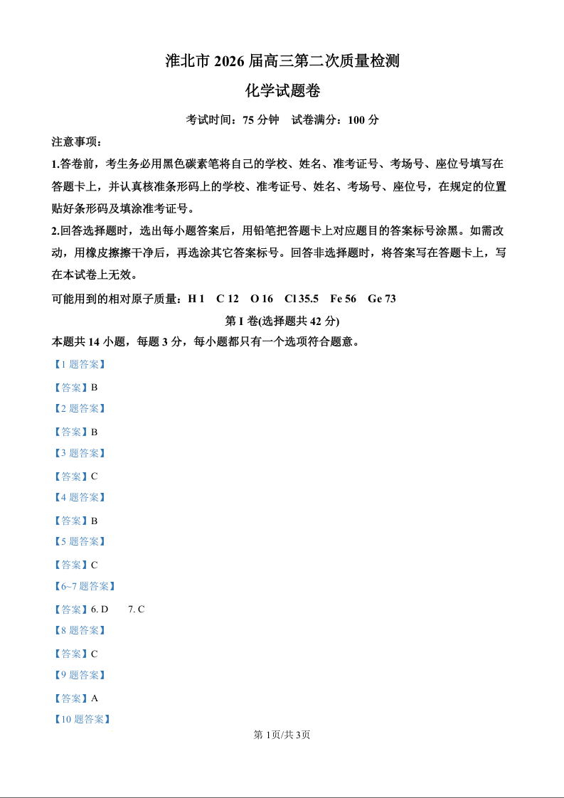 淮北市2026届高三第二次质量检测 化学答案.docx