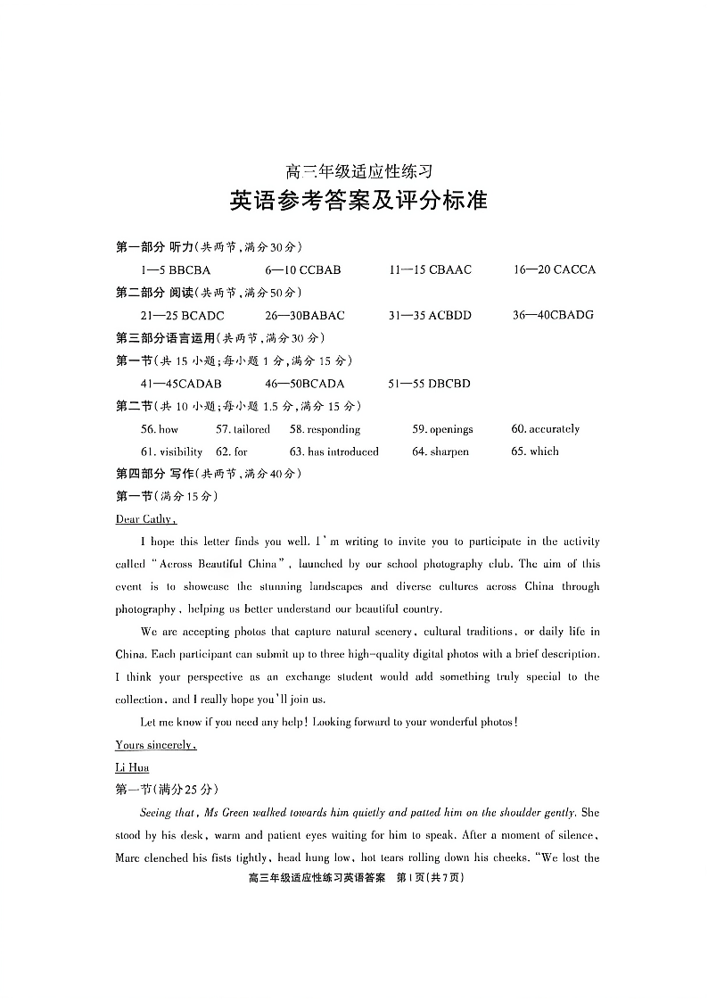 德阳市2026届高三年级适应性练习 英语答案.pdf