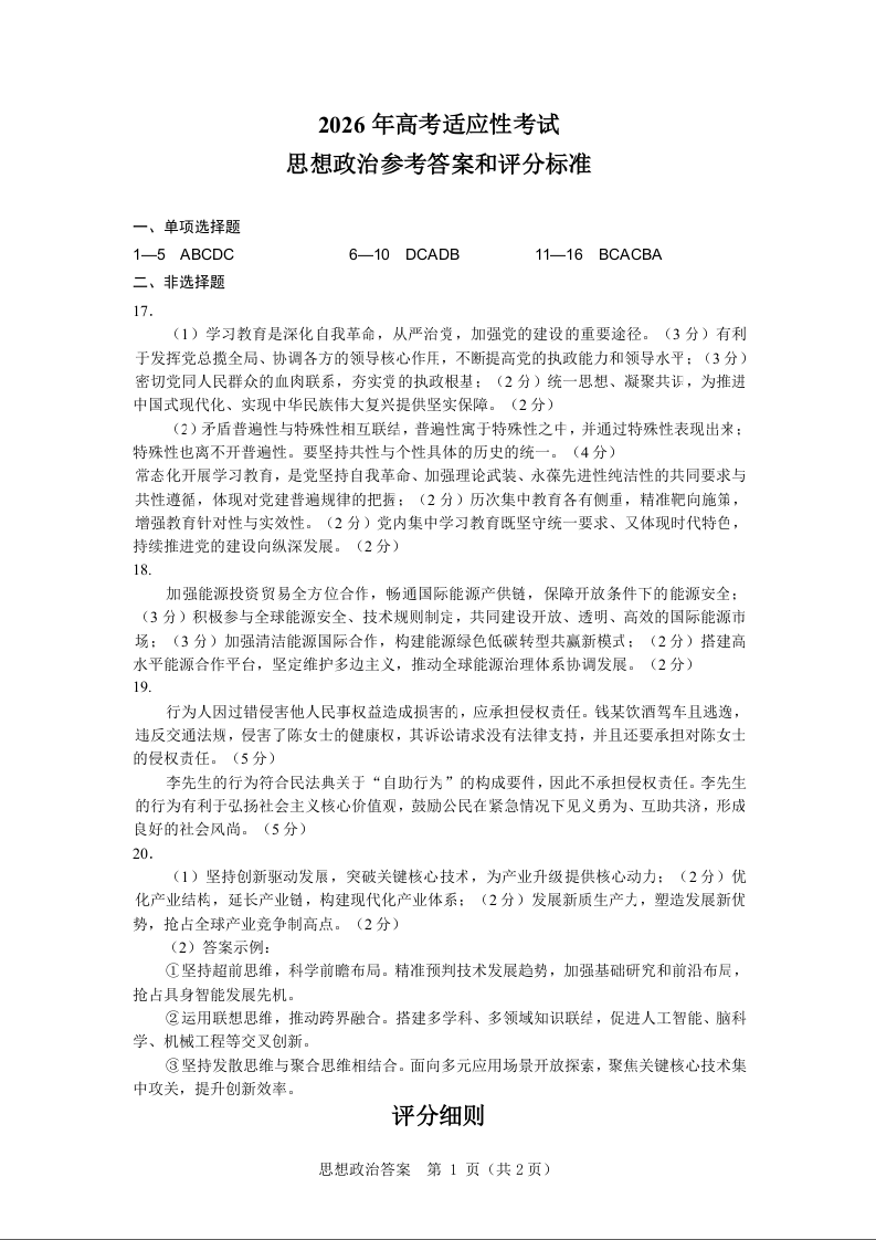 绵阳市2026年高考适应性考试 政治答案.docx