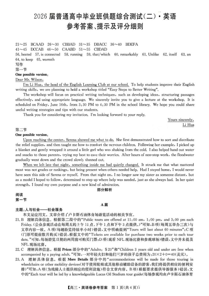 清远市2026届普通高中毕业班供题综合测试(二)英语答案.pdf