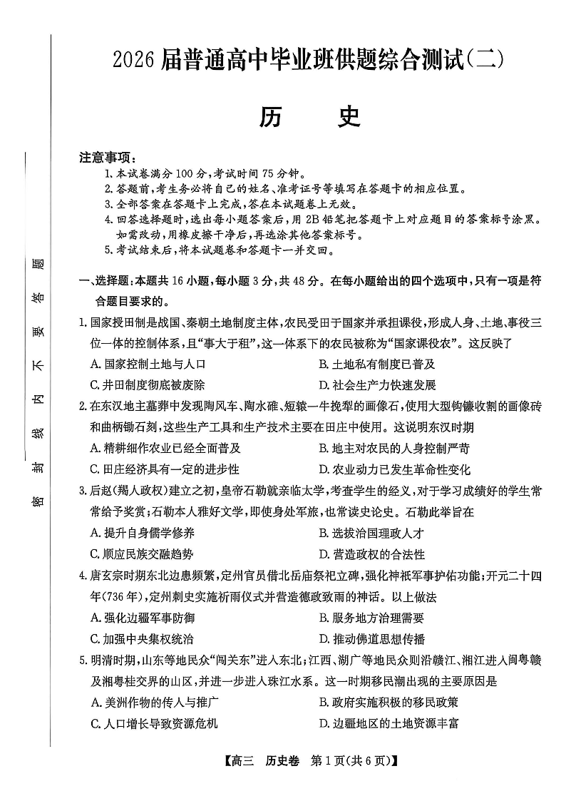清远市2026届普通高中毕业班供题综合测试(二)历史.pdf