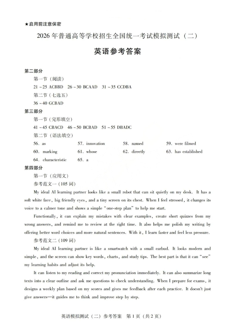 广东省2026年普通高等学校招生全国统一考试模拟测试(二)英语答案.pdf