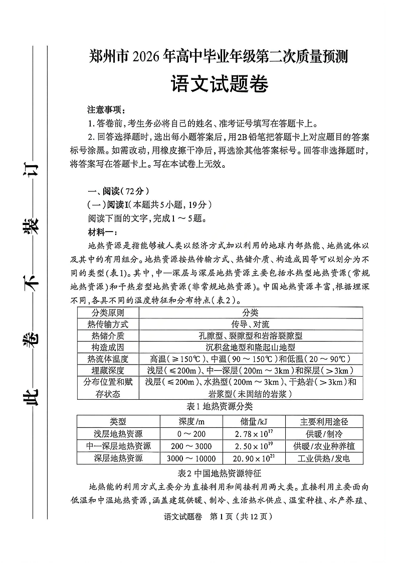郑州市2026年高中毕业年级第二次质量预测 语文.pdf