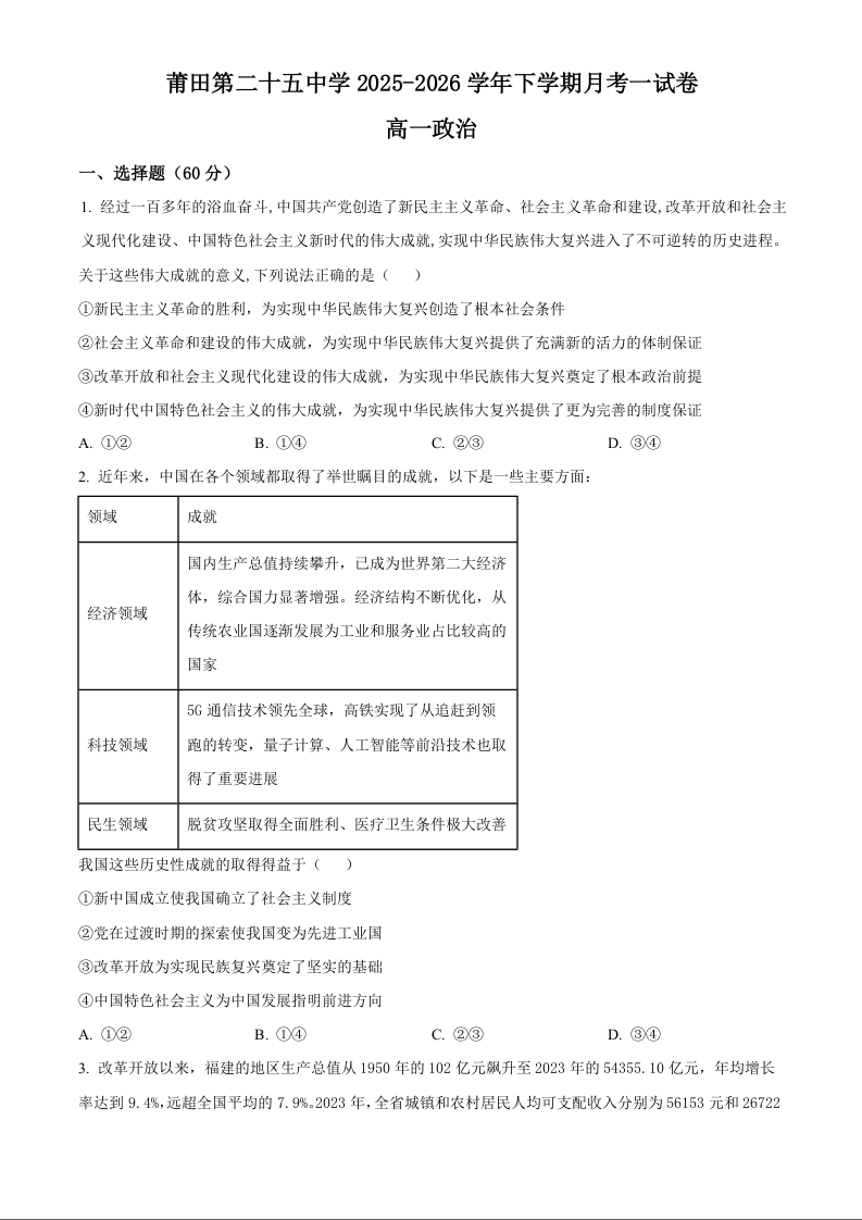 福建省莆田二十五中学2025-2026学年下学期4月月考 政治.docx