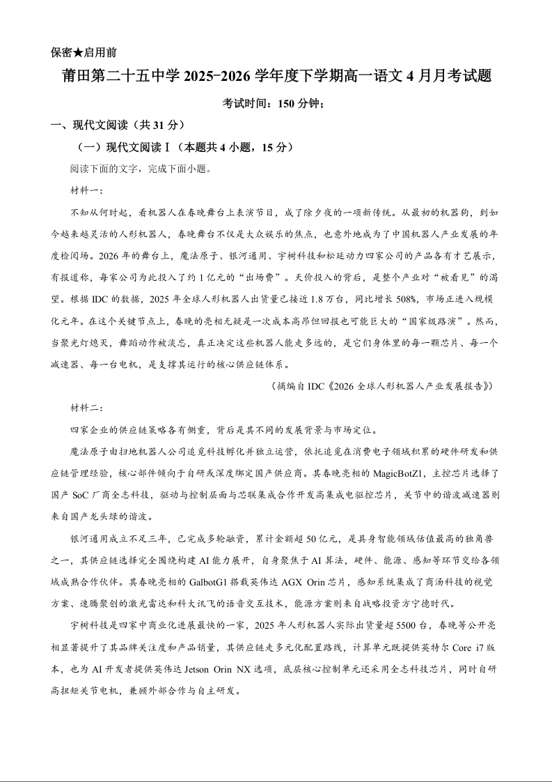 福建省莆田二十五中学2025-2026学年下学期4月月考 语文答案.docx