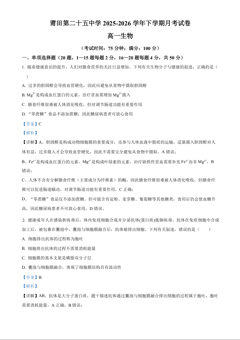 福建省莆田二十五中学2025-2026学年下学期4月月考 生物答案.docx