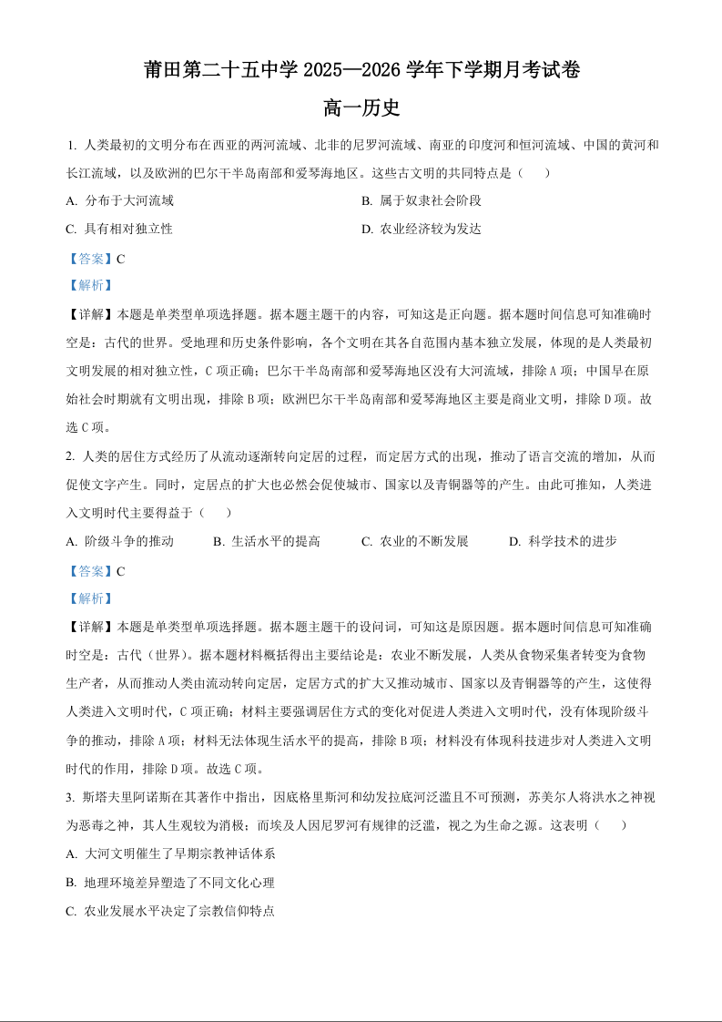 福建省莆田二十五中学2025-2026学年下学期4月月考 历史答案.docx