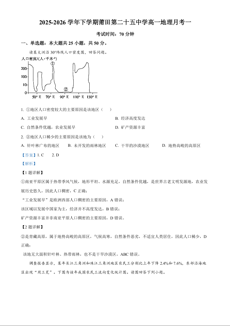 福建省莆田二十五中学2025-2026学年下学期4月月考 地理答案.docx